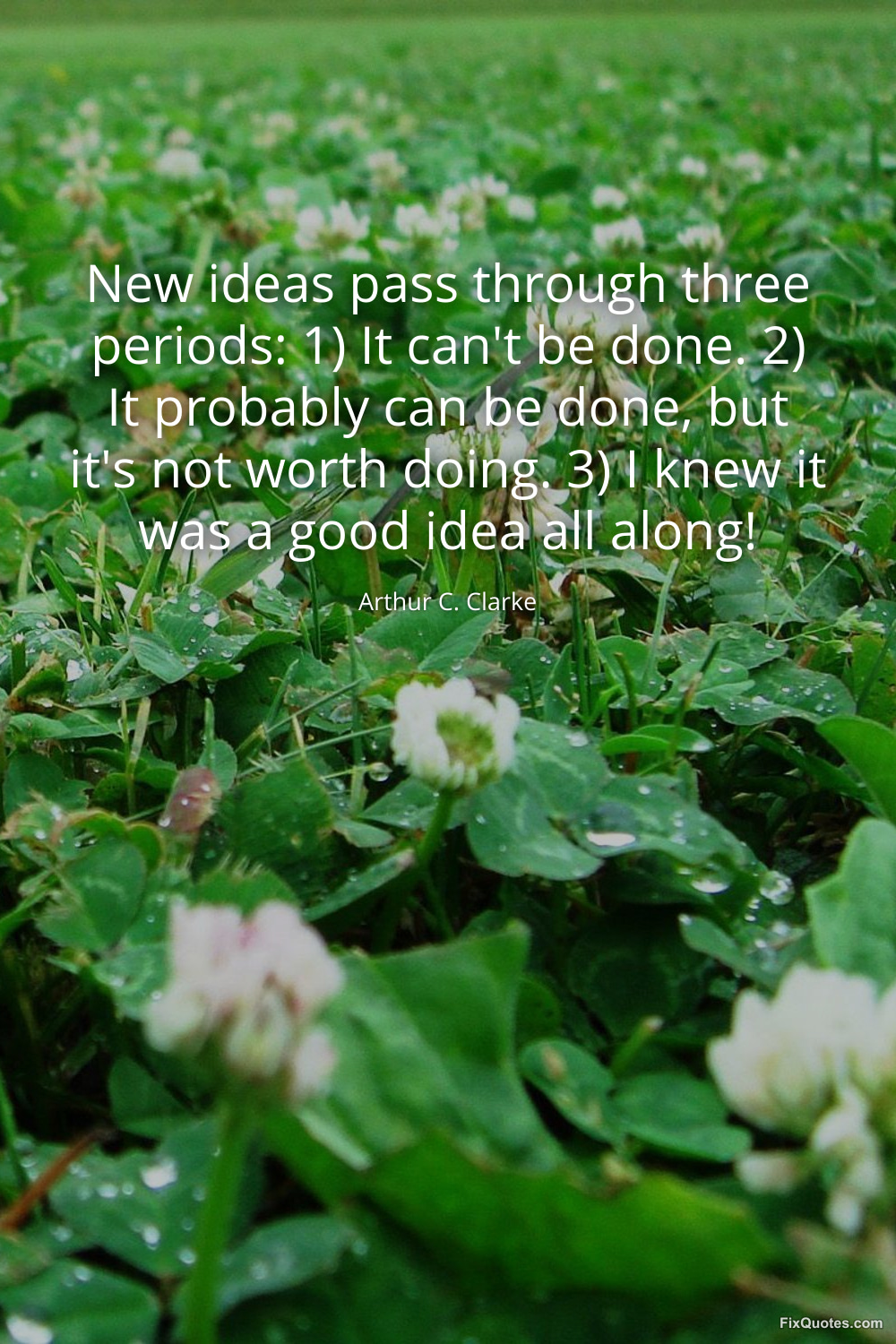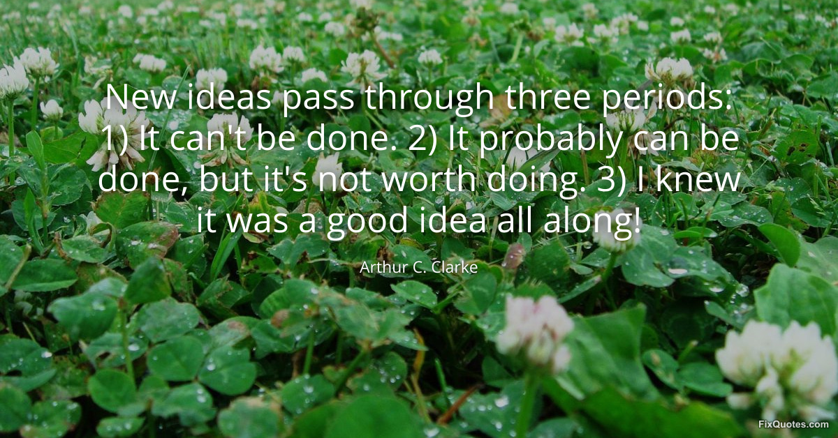 Clarke, Arthur C. "New ideas pass through three periods: 1) It can't be done. 2) It probably can be done, but it's not worth doing. 3) I knew it was a good idea all along!" FixQuotes. January 18, 2026. https://fixquotes.com/quotes/new-ideas-pass-through-three-periods-1-it-cant-be-6470/.