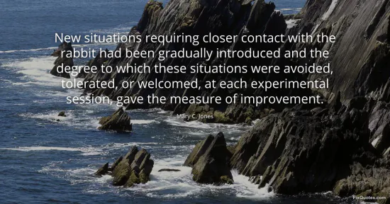 Jones, Mary C. "New situations requiring closer contact with the rabbit had been gradually introduced and the degree to which these situations were avoided, tolerated, or welcomed, at each experimental session, gave the measure of improvement." FixQuotes. January 16, 2026. https://fixquotes.com/quotes/new-situations-requiring-closer-contact-with-the-97279/.