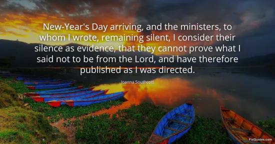 Southcott, Joanna. "New-Year's Day arriving, and the ministers, to whom I wrote, remaining silent, I consider their silence as evidence, that they cannot prove what I said not to be from the Lord, and have therefore published as I was directed." FixQuotes. January 18, 2026. https://fixquotes.com/quotes/new-years-day-arriving-and-the-ministers-to-whom-12032/.