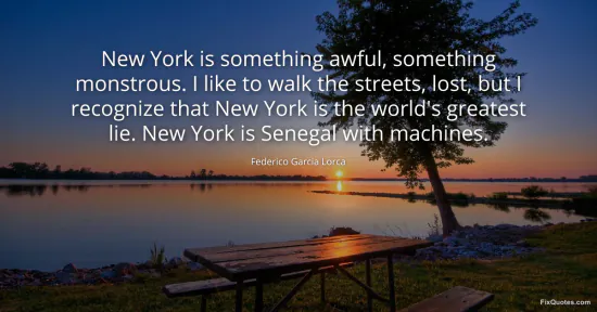 Lorca, Federico Garcia. "New York is something awful, something monstrous. I like to walk the streets, lost, but I recognize that New York is the world's greatest lie. New York is Senegal with machines." FixQuotes. January 17, 2026. https://fixquotes.com/quotes/new-york-is-something-awful-something-monstrous-i-47392/.