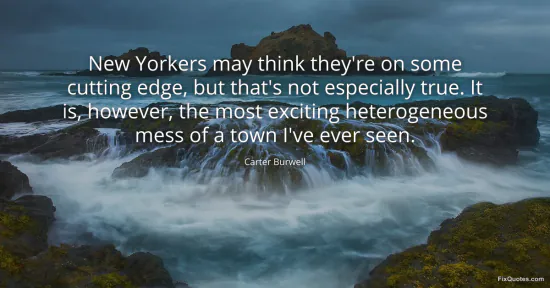 Burwell, Carter. "New Yorkers may think they're on some cutting edge, but that's not especially true. It is, however, the most exciting heterogeneous mess of a town I've ever seen." FixQuotes. January 17, 2026. https://fixquotes.com/quotes/new-yorkers-may-think-theyre-on-some-cutting-edge-73464/.