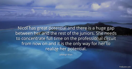 Khan, Jahangir. "Nicol has great potential and there is a huge gap between her and the rest of the juniors. She needs to concentrate full time on the professional circuit from now on and it is the only way for her to realize her potential." FixQuotes. January 17, 2026. https://fixquotes.com/quotes/nicol-has-great-potential-and-there-is-a-huge-gap-54789/.
