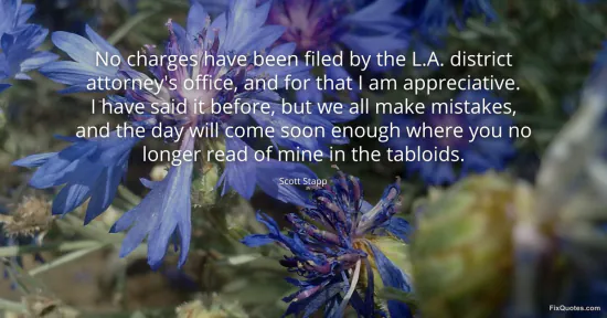 Stapp, Scott. "No charges have been filed by the L.A. district attorney's office, and for that I am appreciative. I have said it before, but we all make mistakes, and the day will come soon enough where you no longer read of mine in the tabloids." FixQuotes. January 16, 2026. https://fixquotes.com/quotes/no-charges-have-been-filed-by-the-la-district-98742/.