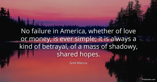 Marcus, Greil. (2026, January 16). No failure in America, whether of love or money, is ever simple; it is always a kind of betrayal, of a mass of shadowy, shared hopes. FixQuotes. https://fixquotes.com/quotes/no-failure-in-america-whether-of-love-or-money-is-122451/