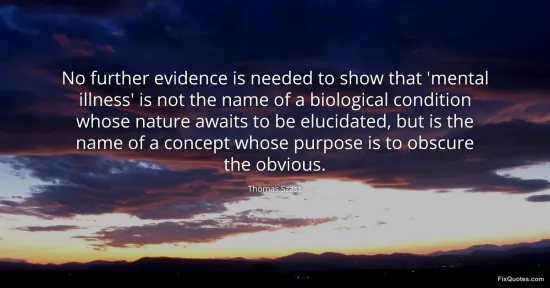 Szasz, Thomas. "No further evidence is needed to show that 'mental illness' is not the name of a biological condition whose nature awaits to be elucidated, but is the name of a concept whose purpose is to obscure the obvious." FixQuotes. January 16, 2026. https://fixquotes.com/quotes/no-further-evidence-is-needed-to-show-that-mental-102689/.