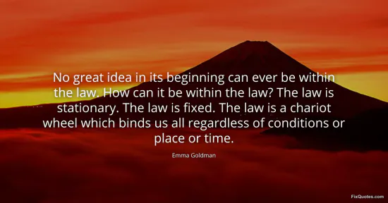 Goldman, Emma. (2026, January 17). No great idea in its beginning can ever be within the law. How can it be within the law? The law is stationary. The law is fixed. The law is a chariot wheel which binds us all regardless of conditions or place or time. FixQuotes. https://fixquotes.com/quotes/no-great-idea-in-its-beginning-can-ever-be-within-58277/