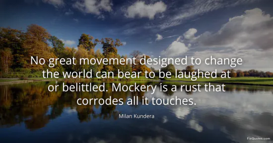 Kundera, Milan. (2026, January 16). No great movement designed to change the world can bear to be laughed at or belittled. Mockery is a rust that corrodes all it touches. FixQuotes. https://fixquotes.com/quotes/no-great-movement-designed-to-change-the-world-103749/