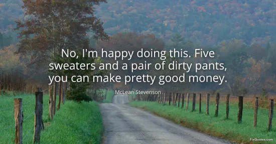 The joke lands because it flatters poverty while quietly cashing in on it. McLean Stevenson, an actor best known for playing the wry, rumpled everyman on M*A*S*H, frames happiness as a kind of stubborn refusal: no, he’s not chasing glamour, he’s content in the unglamorous uniform of working life. “Five sweaters and a pair of dirty pants” is deliberately grotesque specificity. It’s not just “I dress casually”; it’s a caricature of the underpaid artist, the guy who looks like he slept in the writers’ room and still showed up to charm America. The image invites affection, then twists the knife with the punchline: “you can make pretty good money.”