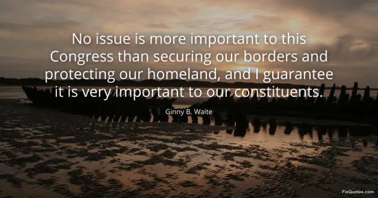 Waite, Ginny B. "No issue is more important to this Congress than securing our borders and protecting our homeland, and I guarantee it is very important to our constituents." FixQuotes. January 17, 2026. https://fixquotes.com/quotes/no-issue-is-more-important-to-this-congress-than-67032/.