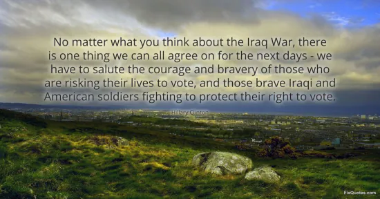 Clinton, Hillary. (2026, February 20). No matter what you think about the Iraq War, there is one thing we can all agree on for the next days - we have to salute the courage and bravery of those who are risking their lives to vote, and those brave Iraqi and American soldiers fighting to protect their right to vote. FixQuotes. https://fixquotes.com/quotes/no-matter-what-you-think-about-the-iraq-war-there-20014/