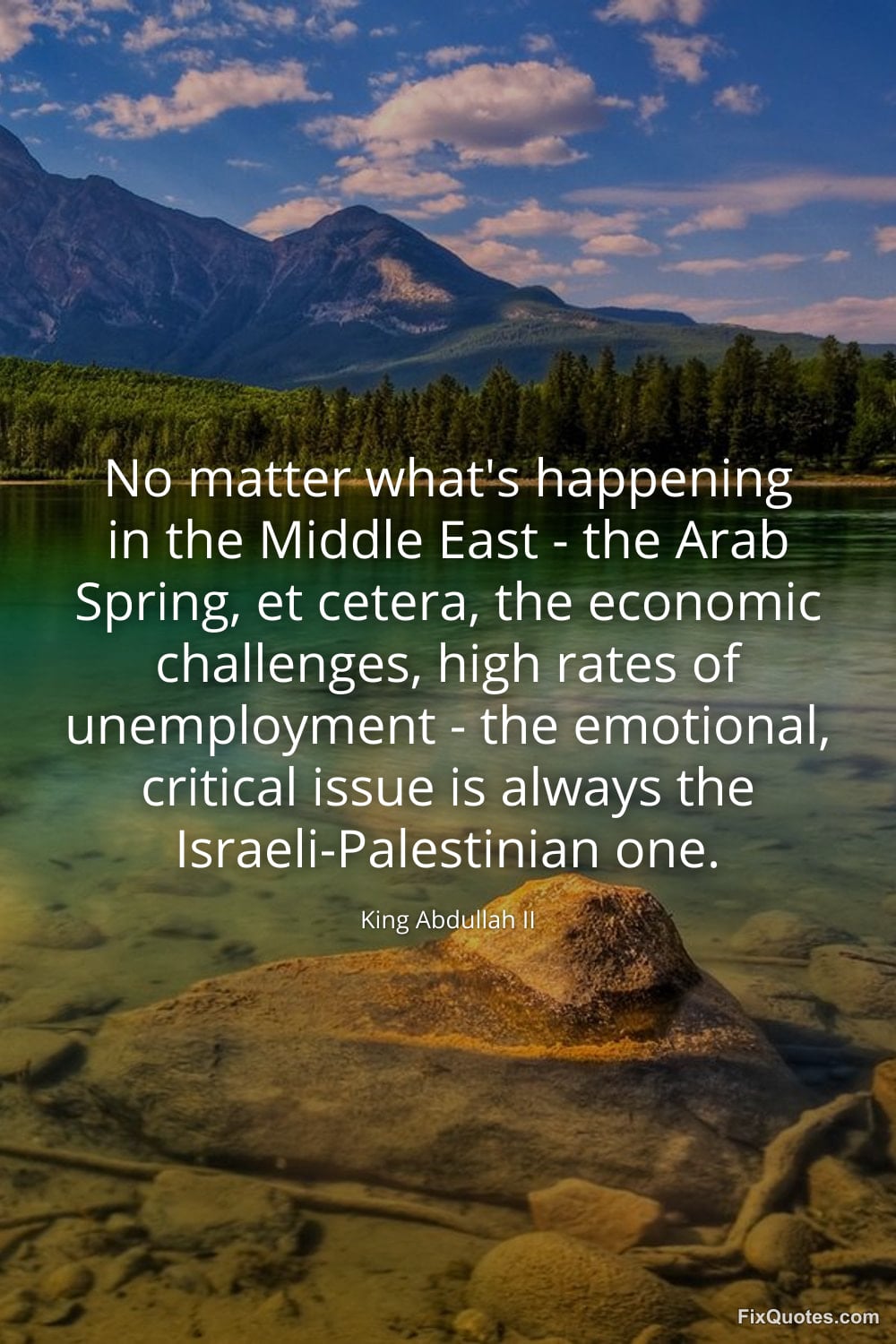 II, King Abdullah. "No matter what's happening in the Middle East - the Arab Spring, et cetera, the economic challenges, high rates of unemployment - the emotional, critical issue is always the Israeli-Palestinian one." FixQuotes. January 15, 2026. https://fixquotes.com/quotes/no-matter-whats-happening-in-the-middle-east-144309/.