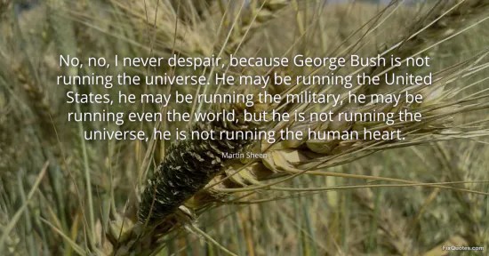 Sheen, Martin. (2026, January 17). No, no, I never despair, because George Bush is not running the universe. He may be running the United States, he may be running the military, he may be running even the world, but he is not running the universe, he is not running the human heart. FixQuotes. https://fixquotes.com/quotes/no-no-i-never-despair-because-george-bush-is-not-64595/