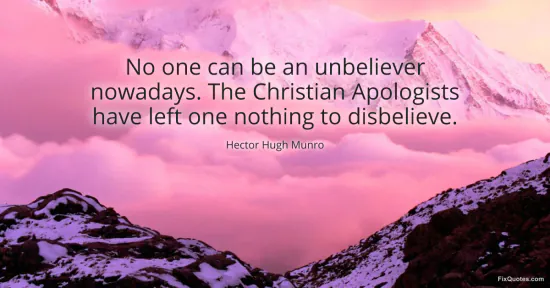 Munro, Hector Hugh. "No one can be an unbeliever nowadays. The Christian Apologists have left one nothing to disbelieve." FixQuotes. January 15, 2026. https://fixquotes.com/quotes/no-one-can-be-an-unbeliever-nowadays-the-144115/.