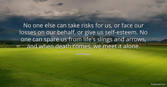Beck, Martha. (2026, January 17). No one else can take risks for us, or face our losses on our behalf, or give us self-esteem. No one can spare us from life's slings and arrows, and when death comes, we meet it alone. FixQuotes. https://fixquotes.com/quotes/no-one-else-can-take-risks-for-us-or-face-our-57829/