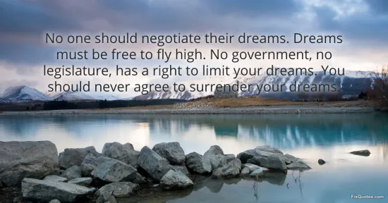 Jackson, Jesse. (2026, January 15). No one should negotiate their dreams. Dreams must be free to fly high. No government, no legislature, has a right to limit your dreams. You should never agree to surrender your dreams. FixQuotes. https://fixquotes.com/quotes/no-one-should-negotiate-their-dreams-dreams-must-164907/