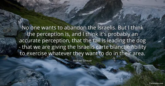 Scheuer, Michael. "No one wants to abandon the Israelis. But I think the perception is, and I think it's probably an accurate perception, that the tail is leading the dog - that we are giving the Israelis carte blanche ability to exercise whatever they want to do in their area." FixQuotes. January 16, 2026. https://fixquotes.com/quotes/no-one-wants-to-abandon-the-israelis-but-i-think-93733/.