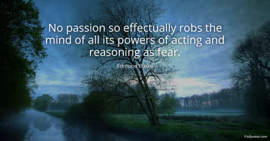 Burke, Edmund. "No passion so effectually robs the mind of all its powers of acting and reasoning as fear." FixQuotes. January 18, 2026. https://fixquotes.com/quotes/no-passion-so-effectually-robs-the-mind-of-all-19200/.