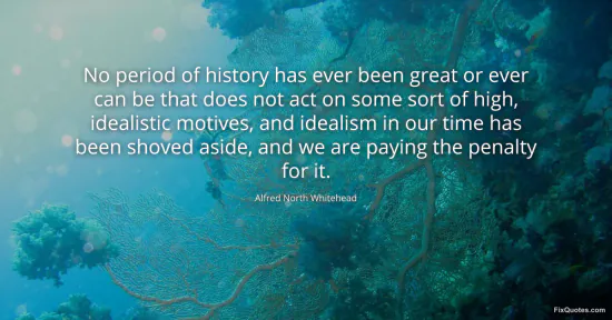 Whitehead, Alfred North. (2026, January 17). No period of history has ever been great or ever can be that does not act on some sort of high, idealistic motives, and idealism in our time has been shoved aside, and we are paying the penalty for it. FixQuotes. https://fixquotes.com/quotes/no-period-of-history-has-ever-been-great-or-ever-40542/