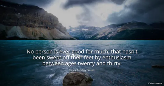 Froude, James Anthony. "No person is ever good for much, that hasn't been swept off their feet by enthusiasm between ages twenty and thirty." FixQuotes. January 16, 2026. https://fixquotes.com/quotes/no-person-is-ever-good-for-much-that-hasnt-been-102160/.
