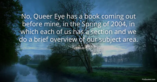 Allen, Ted. (2026, January 16). No, Queer Eye has a book coming out before mine, in the Spring of 2004, in which each of us has a section and we do a brief overview of our subject area. FixQuotes. https://fixquotes.com/quotes/no-queer-eye-has-a-book-coming-out-before-mine-in-86427/