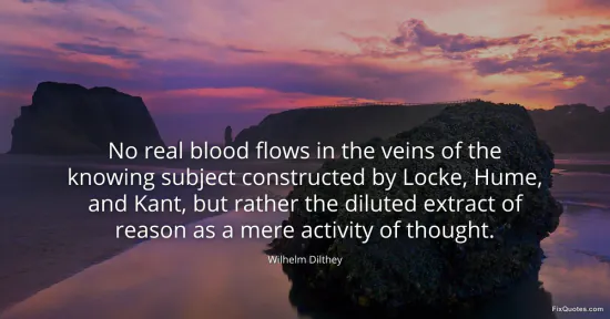 Dilthey, Wilhelm. "No real blood flows in the veins of the knowing subject constructed by Locke, Hume, and Kant, but rather the diluted extract of reason as a mere activity of thought." FixQuotes. January 17, 2026. https://fixquotes.com/quotes/no-real-blood-flows-in-the-veins-of-the-knowing-66533/.