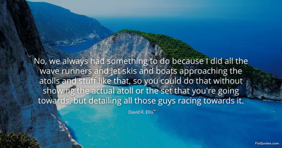Ellis, David R. "No, we always had something to do because I did all the wave runners and jet skis and boats approaching the atolls and stuff like that, so you could do that without showing the actual atoll or the set that you're going towards, but detailing all those guys racing towards it." FixQuotes. January 15, 2026. https://fixquotes.com/quotes/no-we-always-had-something-to-do-because-i-did-141037/.