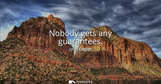 Nobody gets any guarantees captures a flinty, Midwestern realism about life, markets, and politics. It insists that outcomes cannot be promised in advance, only opportunities can be created and seized. Coming from John Engler, a Republican governor of Michigan in the 1990s who later led major business groups, the line reflects an ethic shaped by industrial churn and fiscal constraint. Michigan was wrestling with globalization, automation, and the unraveling of an old social contract built on stable manufacturing jobs. Engler championed welfare-to-work reforms, regulatory tightening, charter schools, and budget discipline, signaling a shift from promises of security toward incentives for adaptability.