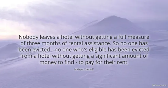 Chertoff, Michael. (2026, January 16). Nobody leaves a hotel without getting a full measure of three months of rental assistance. So no one has been evicted - no one who's eligible has been evicted from a hotel without getting a significant amount of money to find - to pay for their rent. FixQuotes. https://fixquotes.com/quotes/nobody-leaves-a-hotel-without-getting-a-full-115227/