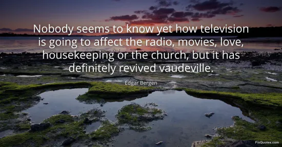 Bergen, Edgar. "Nobody seems to know yet how television is going to affect the radio, movies, love, housekeeping or the church, but it has definitely revived vaudeville." FixQuotes. January 17, 2026. https://fixquotes.com/quotes/nobody-seems-to-know-yet-how-television-is-going-67888/.