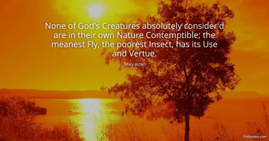 Astell, Mary. (2026, February 18). None of God's Creatures absolutely consider'd are in their own Nature Contemptible; the meanest Fly, the poorest Insect, has its Use and Vertue. FixQuotes. https://fixquotes.com/quotes/none-of-gods-creatures-absolutely-considerd-are-88034/