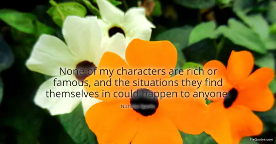 Sparks, Nicholas. "None of my characters are rich or famous, and the situations they find themselves in could happen to anyone." FixQuotes. January 16, 2026. https://fixquotes.com/quotes/none-of-my-characters-are-rich-or-famous-and-the-90086/.