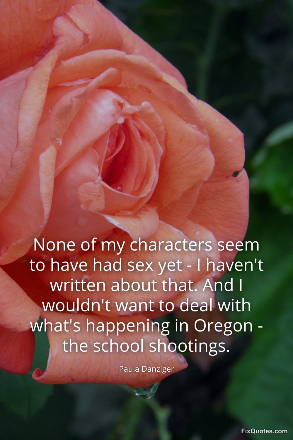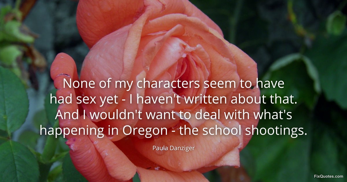 Danziger, Paula. (2026, January 16). None of my characters seem to have had sex yet - I haven't written about that. And I wouldn't want to deal with what's happening in Oregon - the school shootings. FixQuotes. https://fixquotes.com/quotes/none-of-my-characters-seem-to-have-had-sex-yet-130409/