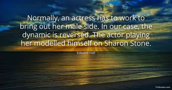 Hall, Edward. "Normally, an actress has to work to bring out her male side. In our case, the dynamic is reversed. The actor playing her modelled himself on Sharon Stone." FixQuotes. January 16, 2026. https://fixquotes.com/quotes/normally-an-actress-has-to-work-to-bring-out-her-100407/.