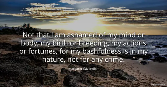 Cavendish, Margaret. "Not that I am ashamed of my mind or body, my birth or breeding, my actions or fortunes, for my bashfulness is in my nature, not for any crime." FixQuotes. January 16, 2026. https://fixquotes.com/quotes/not-that-i-am-ashamed-of-my-mind-or-body-my-birth-105036/.
