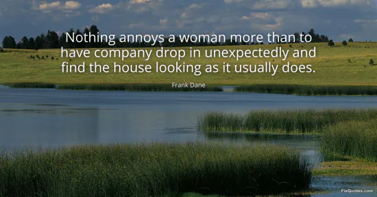 Dane, Frank. "Nothing annoys a woman more than to have company drop in unexpectedly and find the house looking as it usually does." FixQuotes. January 16, 2026. https://fixquotes.com/quotes/nothing-annoys-a-woman-more-than-to-have-company-89863/.