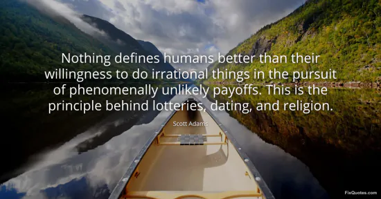 Adams, Scott. "Nothing defines humans better than their willingness to do irrational things in the pursuit of phenomenally unlikely payoffs. This is the principle behind lotteries, dating, and religion." FixQuotes. January 18, 2026. https://fixquotes.com/quotes/nothing-defines-humans-better-than-their-15412/.