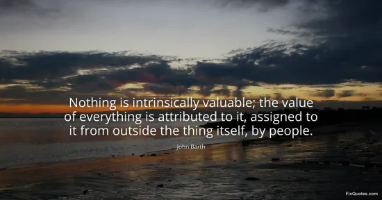 Barth, John. "Nothing is intrinsically valuable; the value of everything is attributed to it, assigned to it from outside the thing itself, by people." FixQuotes. January 16, 2026. https://fixquotes.com/quotes/nothing-is-intrinsically-valuable-the-value-of-113459/.