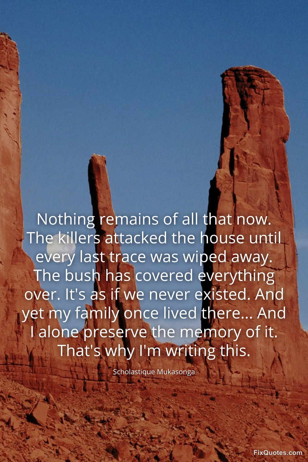 Mukasonga, Scholastique. (2026, February 15). Nothing remains of all that now. The killers attacked the house until every last trace was wiped away. The bush has covered everything over. It's as if we never existed. And yet my family once lived there... And I alone preserve the memory of it. That's why I'm writing this. FixQuotes. https://fixquotes.com/quotes/nothing-remains-of-all-that-now-the-killers-185459/
