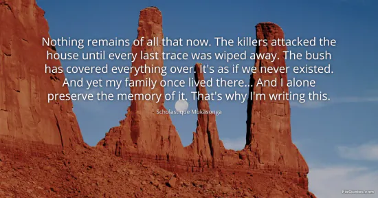 Mukasonga, Scholastique. "Nothing remains of all that now. The killers attacked the house until every last trace was wiped away. The bush has covered everything over. It's as if we never existed. And yet my family once lived there... And I alone preserve the memory of it. That's why I'm writing this." FixQuotes. February 15, 2026. https://fixquotes.com/quotes/nothing-remains-of-all-that-now-the-killers-185459/.
