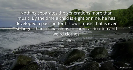 Cosby, Bill. "Nothing separates the generations more than music. By the time a child is eight or nine, he has developed a passion for his own music that is even stronger than his passions for procrastination and weird clothes." FixQuotes. January 18, 2026. https://fixquotes.com/quotes/nothing-separates-the-generations-more-than-music-15365/.