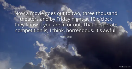Rydell, Mark. "Now a movie goes out to two, three thousand theaters and by Friday night at 10 o'clock they know if you are in or out. That desperate competition is, I think, horrendous. It's awful." FixQuotes. January 16, 2026. https://fixquotes.com/quotes/now-a-movie-goes-out-to-two-three-thousand-134146/.