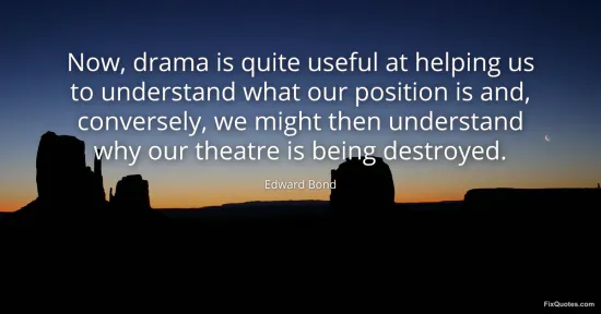 Bond, Edward. "Now, drama is quite useful at helping us to understand what our position is and, conversely, we might then understand why our theatre is being destroyed." FixQuotes. January 17, 2026. https://fixquotes.com/quotes/now-drama-is-quite-useful-at-helping-us-to-47697/.