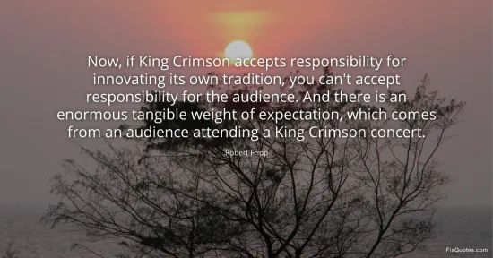 Fripp, Robert. "Now, if King Crimson accepts responsibility for innovating its own tradition, you can't accept responsibility for the audience. And there is an enormous tangible weight of expectation, which comes from an audience attending a King Crimson concert." FixQuotes. January 15, 2026. https://fixquotes.com/quotes/now-if-king-crimson-accepts-responsibility-for-145026/.