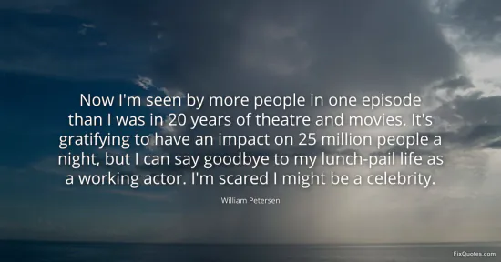 Petersen, William. (2026, January 16). Now I'm seen by more people in one episode than I was in 20 years of theatre and movies. It's gratifying to have an impact on 25 million people a night, but I can say goodbye to my lunch-pail life as a working actor. I'm scared I might be a celebrity. FixQuotes. https://fixquotes.com/quotes/now-im-seen-by-more-people-in-one-episode-than-i-98591/