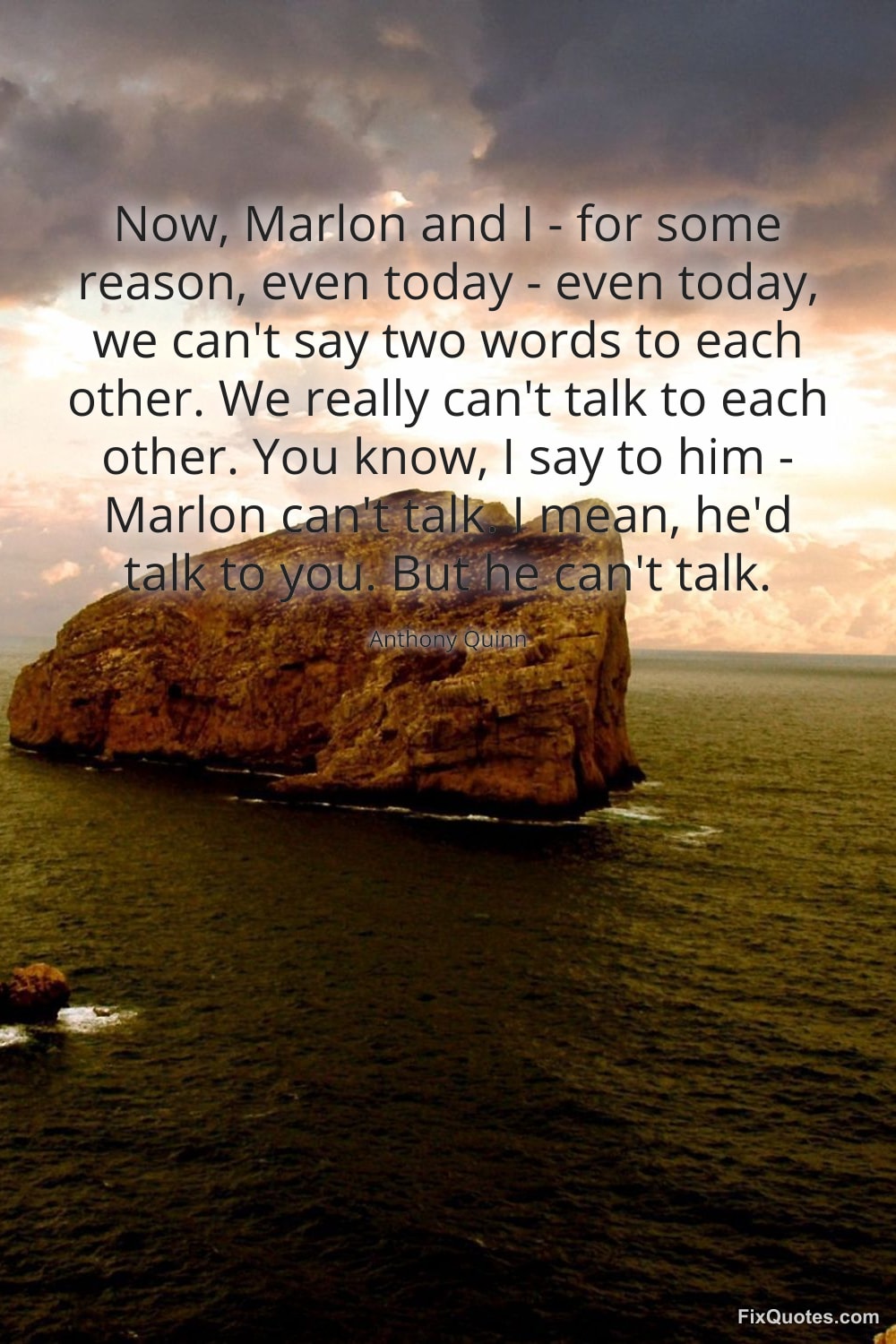 Quinn, Anthony. "Now, Marlon and I - for some reason, even today - even today, we can't say two words to each other. We really can't talk to each other. You know, I say to him - Marlon can't talk. I mean, he'd talk to you. But he can't talk." FixQuotes. January 17, 2026. https://fixquotes.com/quotes/now-marlon-and-i-for-some-reason-even-today-60987/.