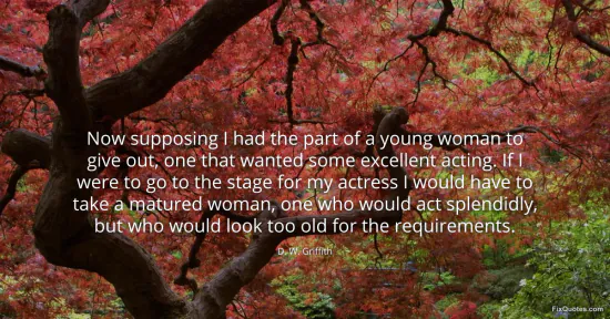 Griffith, D. W. (2026, January 15). Now supposing I had the part of a young woman to give out, one that wanted some excellent acting. If I were to go to the stage for my actress I would have to take a matured woman, one who would act splendidly, but who would look too old for the requirements. FixQuotes. https://fixquotes.com/quotes/now-supposing-i-had-the-part-of-a-young-woman-to-150375/