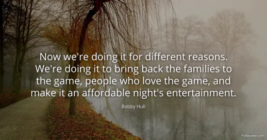 Hull, Bobby. "Now we're doing it for different reasons. We're doing it to bring back the families to the game, people who love the game, and make it an affordable night's entertainment." FixQuotes. January 17, 2026. https://fixquotes.com/quotes/now-were-doing-it-for-different-reasons-were-43613/.
