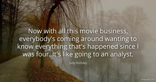 Holliday, Judy. "Now with all this movie business, everybody's coming around wanting to know everything that's happened since I was four. It's like going to an analyst." FixQuotes. January 17, 2026. https://fixquotes.com/quotes/now-with-all-this-movie-business-everybodys-69027/.