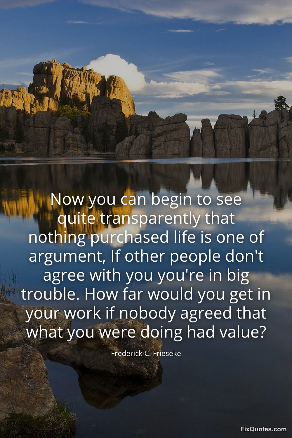 Frieseke, Frederick C. (2026, January 15). Now you can begin to see quite transparently that nothing purchased life is one of argument, If other people don't agree with you you're in big trouble. How far would you get in your work if nobody agreed that what you were doing had value? FixQuotes. https://fixquotes.com/quotes/now-you-can-begin-to-see-quite-transparently-that-173401/