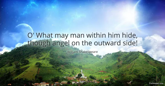 Shakespeare aims a dagger at appearances: the line marvels at how easily virtue can be costumed. The cry of "O'" is not decorative; it’s alarm, almost disgust, as if the speaker has just watched a human face hold its smile while something predatory shifts behind the eyes. "Man within him hide" makes deceit feel less like a one-off lie and more like an internal architecture - secret rooms, locked doors, concealed motives. Then comes the flourish that makes it sting: "angel on the outward side". Shakespeare doesn’t pick "good" or "kind". He picks the most sanctified image available, implying that hypocrisy isn’t merely social; it borrows the language of holiness.